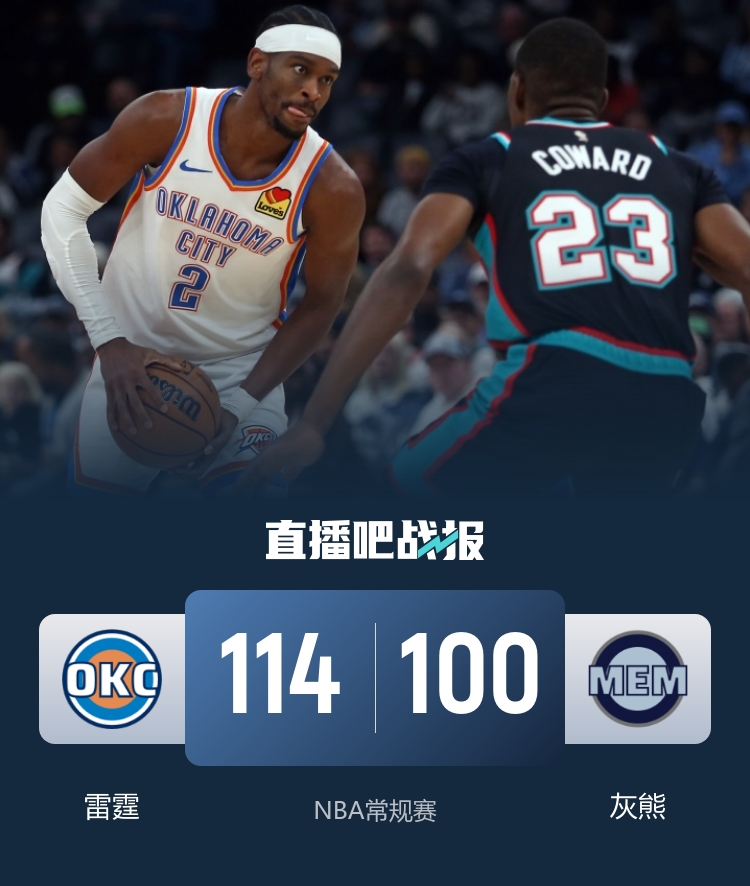 2025-11-12 09:30:02三分命中率23.3% 雷霆19分逆转灰熊 SGA35+7+6 莫兰特18中3