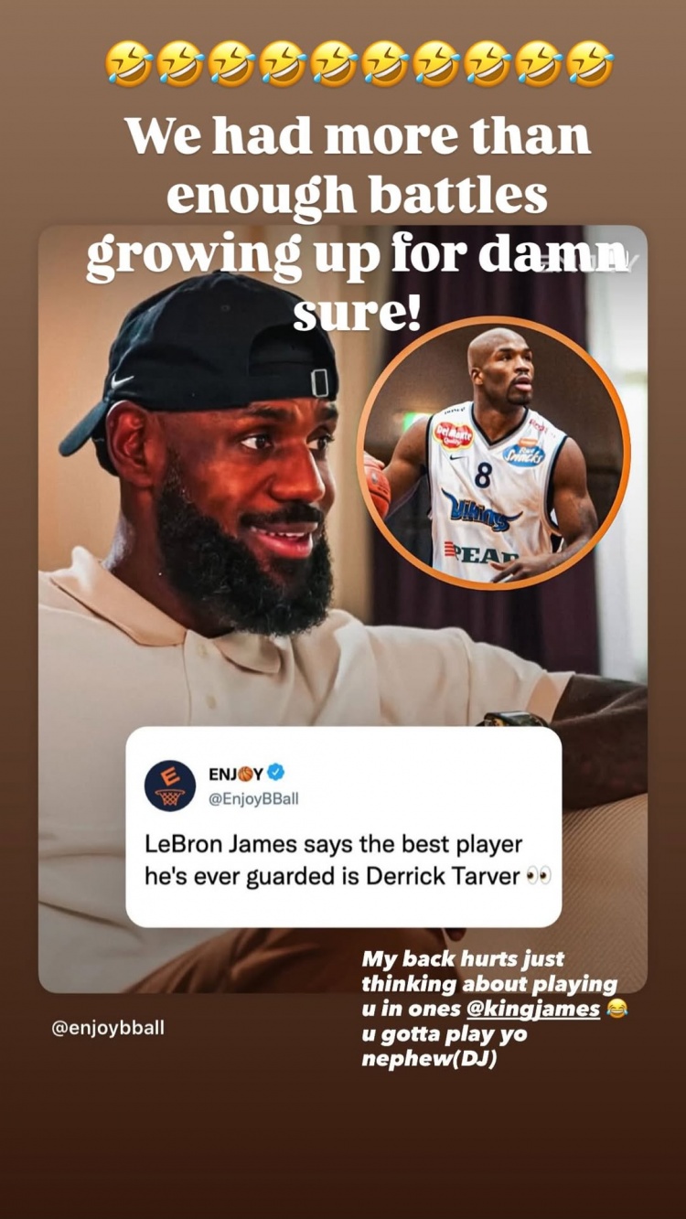 塔弗本人在Instagram上转发了这段采访并写道:“光是想到和你的那些交手,我的背就会痛起来@詹姆斯 你现在还是跟你侄子(DJ,即塔弗的儿子)对位吧。”