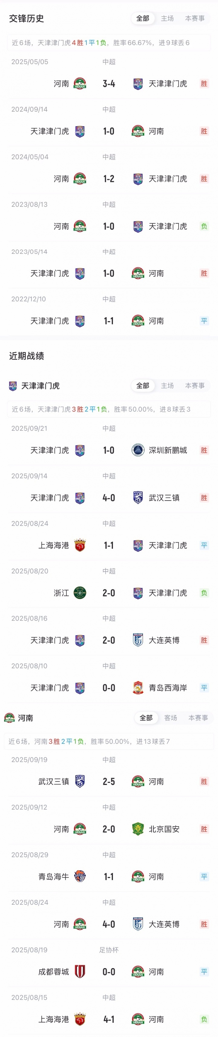 两队近期中超均取得两连胜,津门虎积分40分排在积分榜第6;河南29分排第11。近3次交手,津门虎均击败河南。